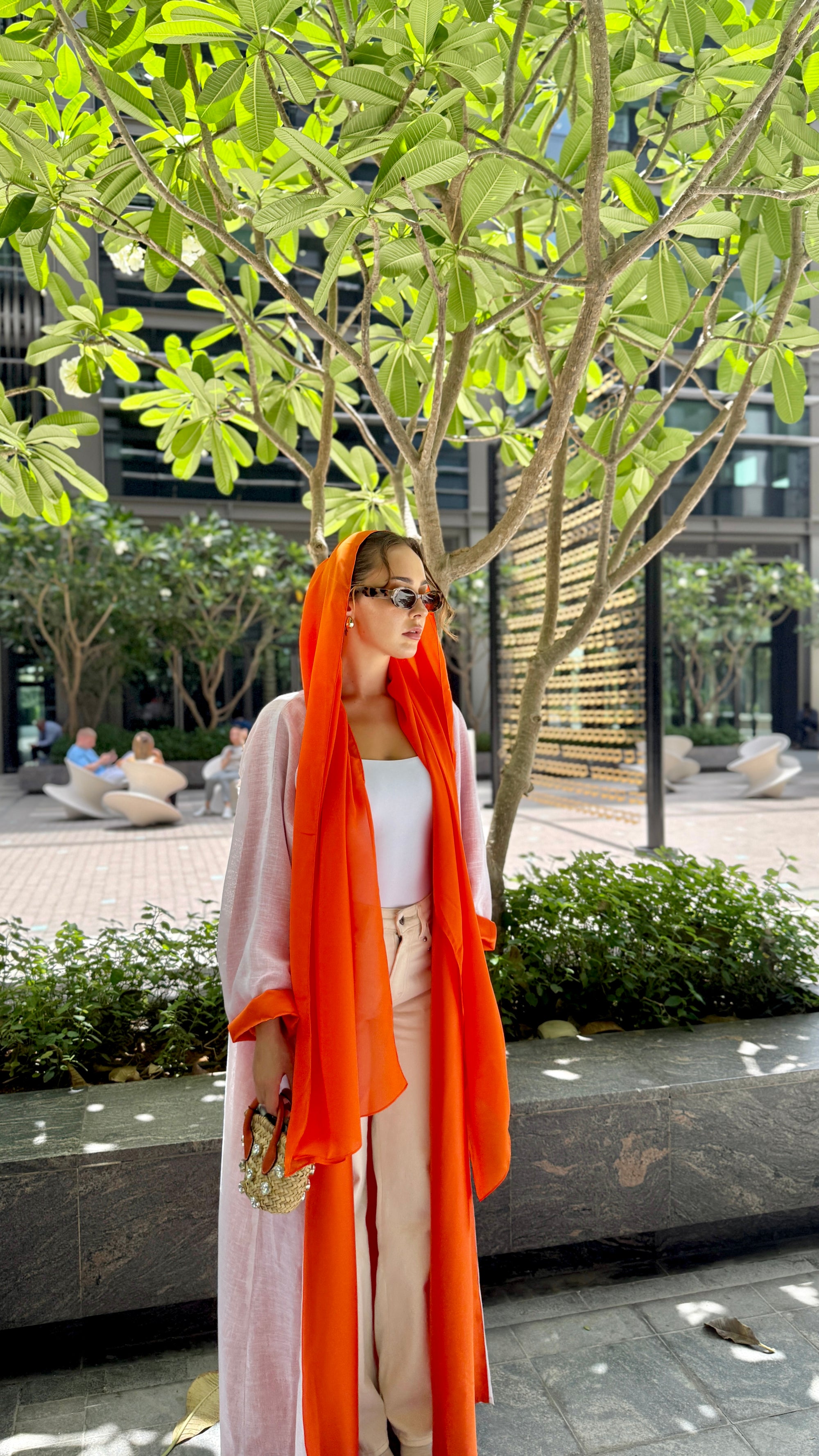 Soft, airy, and thoughtfully designed, the Orange Blossom Abaya features a beautiful double-color look that can be styled two ways. Whether you're heading to a relaxed evening gathering or a special occasion, its flowy fabric and effortless charm make it a standout choice for warm-weather dressing.